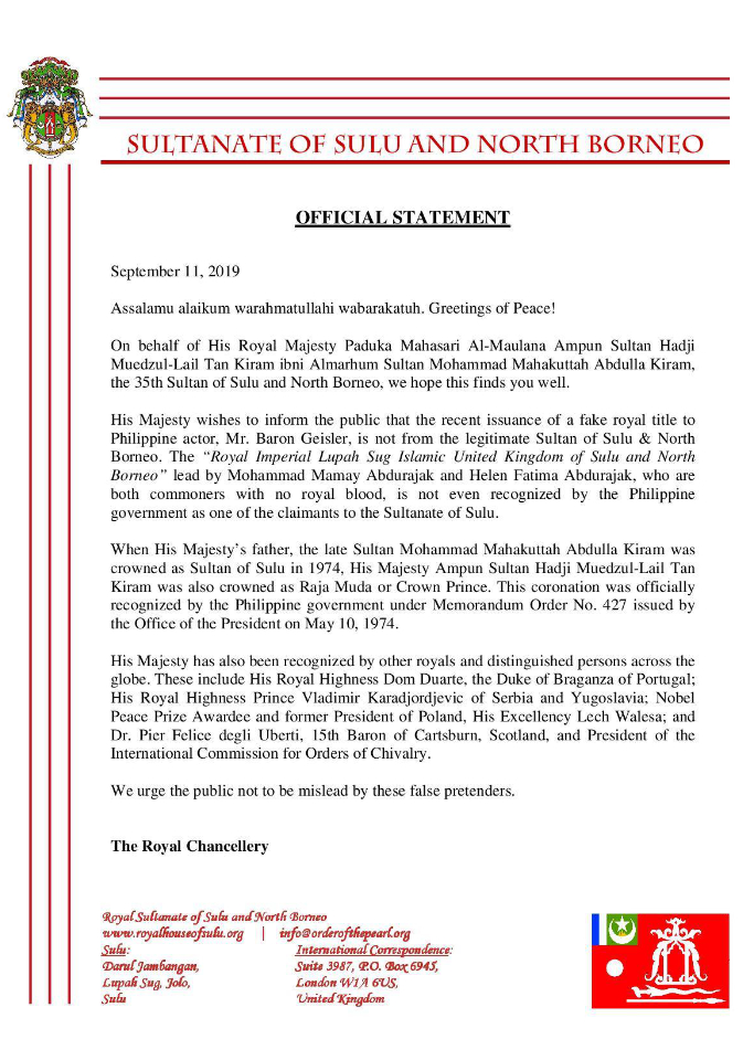 In the statement dated September 11, The Royal House of Sulu’s Chancellery said His Royal Majesty Paduka Masahari Al-Maulana Ampun Sultan Hadji Muedzul-Lail Tan Kiram ibni Almarhum Sultan Mohammad Mahakuttah Abdulla Kiram, the 35th Sultan of Sulu and North Borneo, “wishes to inform the public that the recent issuance of a fake royal title to Philippine actor, Mr. Baron Geisler, is not from the legitimate Sultan of Sulu & North Borneo.”