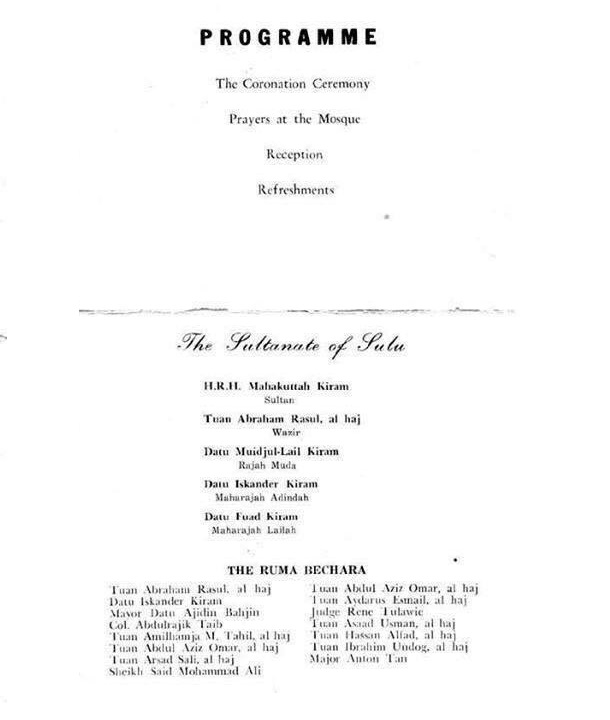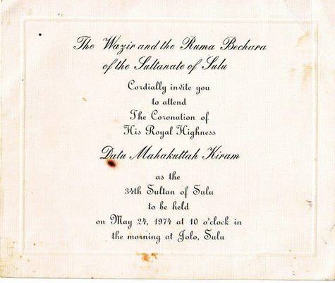 In 1974, Sultan Mohd. Esmail died and was duly succeeded by his son and heir Mohammad Mahakuttah Kiram. The accession of the new Sultan was solemnly recognised by the Filipino President, under whose act Manila acknowledged not only the personal status of the Sultan-King but also the formation of the government of Sulu. Presidential representatives attended the coronation of H.M. Sultan Mahakutta on 24th May 1974. On this occasion, Mahacutta’s son and heir – H.R.H. Datu Muedzul Lail – was installed (and formally recognized by the Filipino state) as the Raja Muda (Prince Royal and heir apparent).